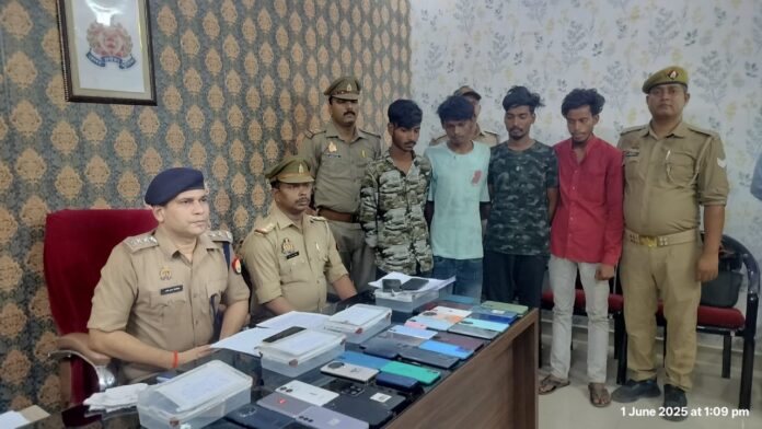 चंदौली। जनपद के मुग़लसराय कोतवाली पुलिस ने एक बड़ी सफलता हासिल करते हुए ट्रेनों और घरों में चोरी की घटनाओं को अंजाम देने वाले शातिर चोर गिरोह का पर्दाफाश किया है। पुलिस ने इस गिरोह के चार सदस्यों को गिरफ्तार किया है, जिनके पास से कुल 30 चोरी के मोबाइल फोन और 7600 रुपये नकद बरामद हुए हैं। जब्त मोबाइलों की अनुमानित कीमत लगभग 5 लाख रुपये बताई जा रही है।