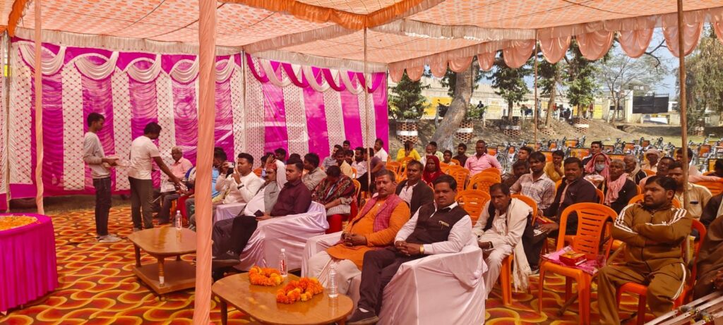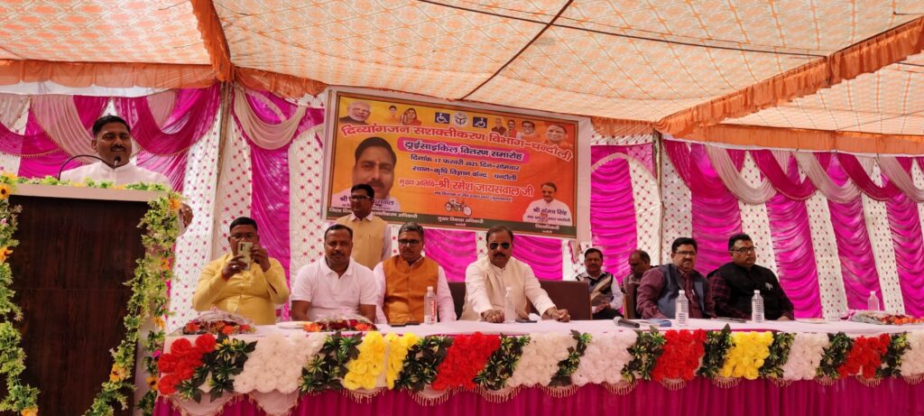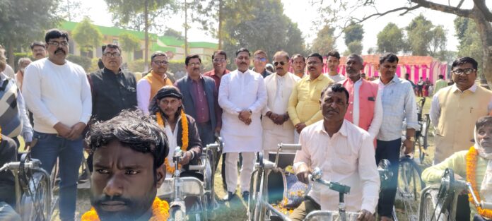PRAHAR DUSTAK/चन्दौली। जिले के दिव्यांग सशक्तिकरण विभाग की ओर से सोमवार को कृषि विज्ञान केंद्र परिसर में कृत्रिम यंत्र व ट्राई साइकिल वितरण समारोह आयोजित किया गया। इस दौरान 45 दिव्यांगजनों को ट्राई साईकिल का वितरण किया गया। कार्यक्रम का शुभारंभ मुगलसराय विधायक रमेश जायसवाल व ब्लाक प्रमुख सदर संजय सिंह बबलू द्वारा संयुक्त रूप से दीप प्रज्ज्वलित करके कार्यक्रम की शुरूआत की गयी।
