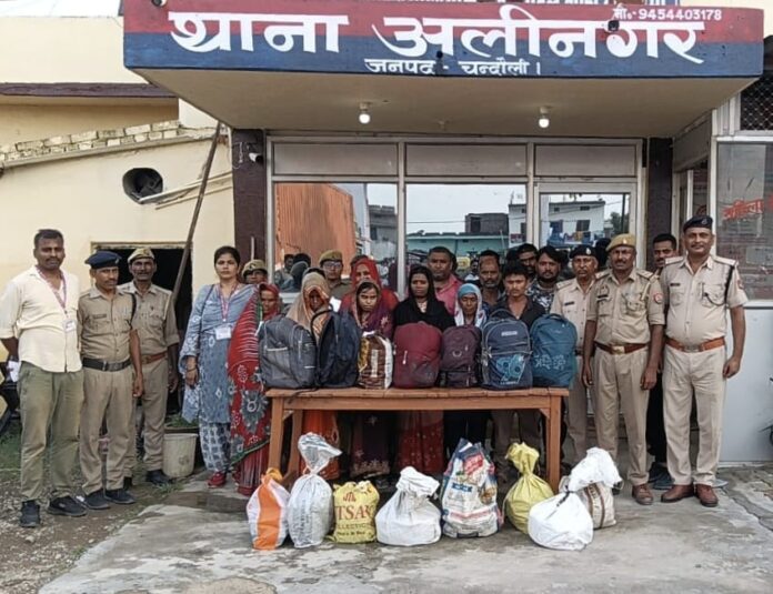 PRAHAR DUSTAK/चन्दौली । जिले के अलीनगर पुलिस और रेलवे सुरक्षा बल की संयुक्त टीम ने लोको कॉलोनी स्थित रेलवे ओवरब्रिज के समीप से रविवार को सात महिलाओं सहित 13 अंतरराज्यीय तस्करों को करीब एक लाख बीस हजार रुपए मूल्य की 109 लीटर अवैध अंग्रेजी शराब के साथ पकड़ा। जिनके खिलाफ मुकदमा दर्ज कर पुलिस अगली कार्रवाई में जुट गई।