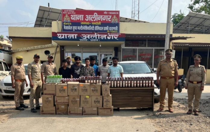 इस संबंध में सीओ पीडीडीयू नगर राजीव सिसोदिया ने बताया कि अलीनगर थाना प्रभारी निरीक्षक विनोद मिश्रा, मय एसआई अनिल यादव और अनन्त भार्गव पुलिस टीम के साथ क्षेत्र में गश्त कर रहे थे। इसीबीच मुखबिर की सूचना पर आलमपुर अंडरपास के समीप वाहनों की जांच पड़ताल करने लगे। इस दौरान चंदौली की ओर एक साथ जा रही तीन कारों को पुलिस ने रुकने का इशारा किया। इस पर तस्कर वाहनों को खड़ा कर भागने लगे। जिन्हें पुलिस ने पीछा कर पकड़ लिया। पुलिस ने जब वाहनों की जांच पड़ताल की तो तीनों कारों में कुल 43 पेटी हरियाणा प्रांत में निर्मित अवैध शराब बरामद हुई। पूछताछ में आरोपितों ने बताया कि उक्त शराब हरियाणा से कन्टेनर में भरकर एक व्यक्ति वाराणसी के रामनगर थाना क्षेत्र के टेंगरा मोड़ के समीप लेकर आता है। जिससे वे कम दाम पर खरीद कर बिहार में अधिक दाम पर बेचते हैं। जो उनके आय का साधन है। पुलिस आरोपित बिहार के समस्तीपुर जिले के शिवाजी नगर थाना क्षेत्र के खानपुर दोखटा निवासी सोनू सिंह, पटना के राजीव नगर थाना क्षेत्र के नील कंठ कॉलोनी सेक्टर 2 आशियाना नगर निवासी शास्वत कुमार, हरियाणा के चरखी दादरी जिले के बाढणा थाना क्षेत्र के खोरड़ा निवासी आनन्द प्रकाश, पटना के पाटिलपुर थाना क्षेत्र के इंद्रपुरी रोड निवासी आर्यन कुमार पांडेय, बिहार के समस्तीपुर जिले के शिवाजीनगर थाना क्षेत्र के धीवाहि परसा निवासी प्रकाश गौरव और सरहिला गांव निवासी सुभाष कुमार के खिलाफ मुकदमा पंजीकृत कर अगली कार्रवाई में जुट गई। इस बाबत क्षेत्राधिकारी राजीव सिसोदिया ने बताया कि पकड़ी गई शराब की कुल कीमत पांच लाख रुपए है।