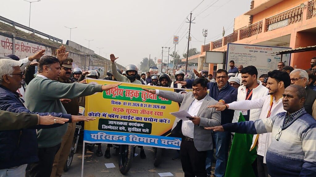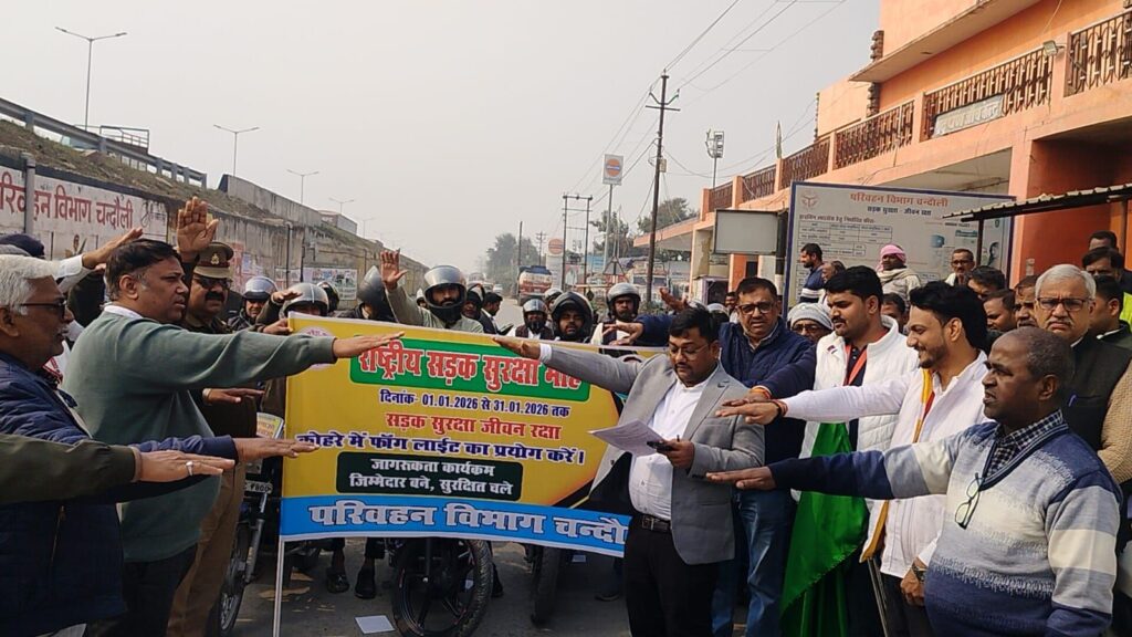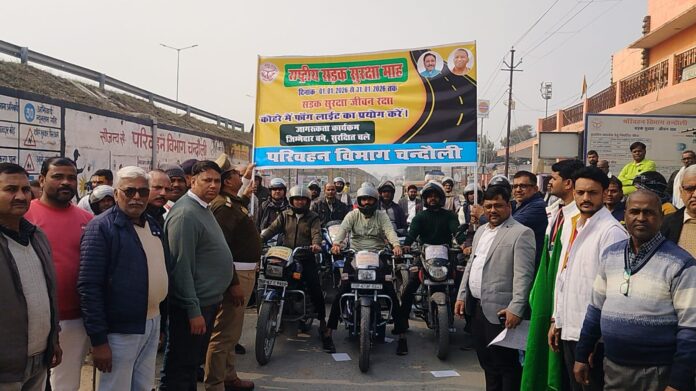 PRAHAR DUSTAK/चन्दौली। केंद्र सरकार के सड़क परिवहन एवं राजमार्ग मंत्रालय के निर्देश पर आयोजित राष्ट्रीय सड़क सुरक्षा माह जिले में गुरुवार को एआरटीओ कार्यालय से शुरू हुआ। इसका शुभारंभ प्रभारी एआरटीओ धनवीर यादव ने शपथ दिलाकर और बाइक रैली को हरी झंडी दिखाकर कर किया। इसमें लोगों को सड़क सुरक्षा से सम्बंधित जानकारी दी गई।