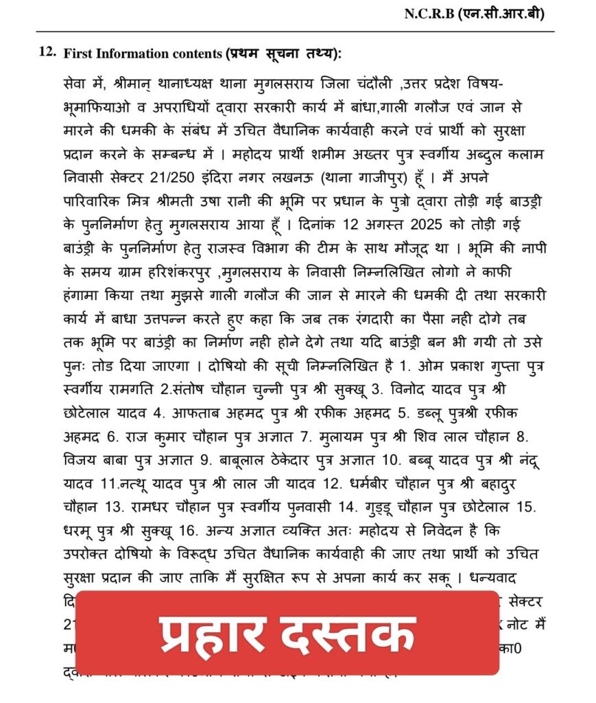 चंदौली जिले के मुगलसराय कोतवाली अंतर्गत ग्राम हरिशंकरपुर में भूमि की बाउंड्री निर्माण के दौरान भूमाफियाओं और दबंगों पर हंगामा करने, गाली-गलौज करने, जान से मारने की धमकी देने और रंगदारी मांगने का आरोप लगा है। प्रार्थी शमीम अख्तर निवासी लखनऊ ने थानाध्यक्ष मुगलसराय को प्रार्थना पत्र देकर 16 नामजद व अज्ञात के खिलाफ कार्रवाई और सुरक्षा की मांग की है।