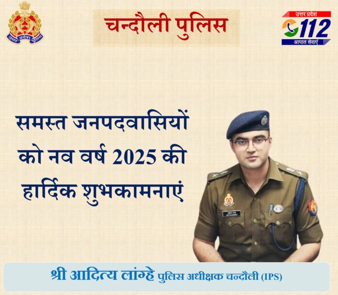 चंदौली जिले के पुलिस अधीक्षक आदित्य लाग्घे ने नव वर्ष के अवसर पर जिलेवासियों को हार्दिक शुभकामनाएं दी है। उन्होंने अपने संदेश में कहा कि यह वर्ष सभी के जीवन में सुख समृद्धि और शांति लेकर आए। उन्होंने जनता से सड़क सुरक्षा और ट्रैफिक नियमों का पालन करने की अपील की, ताकि कोई अप्रिय घटना न घटे।