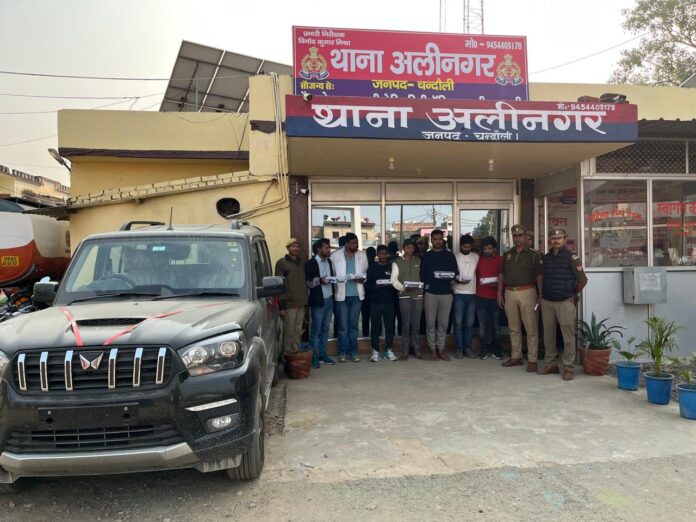 चन्दौली जिले की अलीनगर पुलिस ने बीते सोमवार को गोधना नहर के समीप सात वांछित साइबर फ्रॉड अपराधियों को गिरफ्तार किया। जिनके पास से पुलिस ने बिना नंबर प्लेट स्कॉर्पियो, भारी मात्रा में मोबाइल फोन, सिम कार्ड, एटीएम कार्ड, आधार कार्ड आदि बरामद किया। तत्पश्चात पुलिस अगली कार्रवाई में जुट गई।